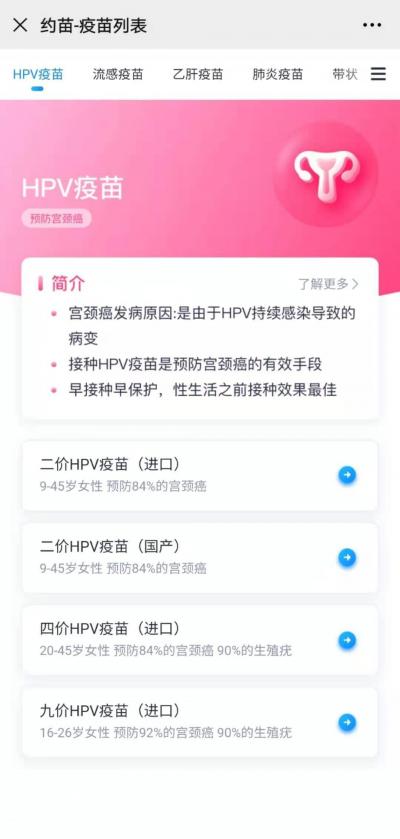 第一步:进入平台(以下以约苗平台为例),选择HPV疫苗,选择【四价】进入各个社区或医院列表