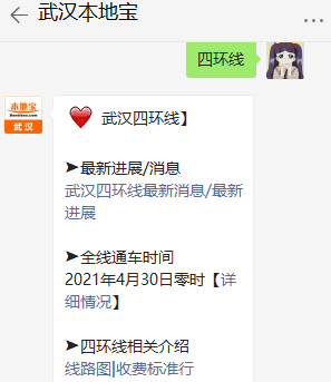 温馨提示:微信搜索公众号武汉本地宝,关注后在对话框回复【四环线】可获武汉四环线最新进展、线路图及收费标准。