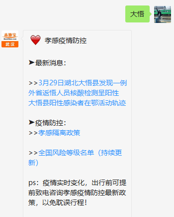 温馨提示:微信搜索公众号武汉本地宝,关注后在对话框回复【大悟】可查询2022孝感外地返乡政策(隔离核酸要求/报备要求)、大悟县最新防疫通知。