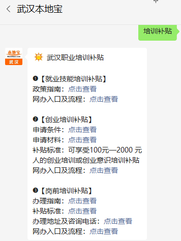 温馨提示:微信搜索公众号武汉本地宝,关注后在对话框回复【培训补贴】可获武汉各职业培训补贴网上申办入口、申请条件流程材料、金额标准、咨询方式。