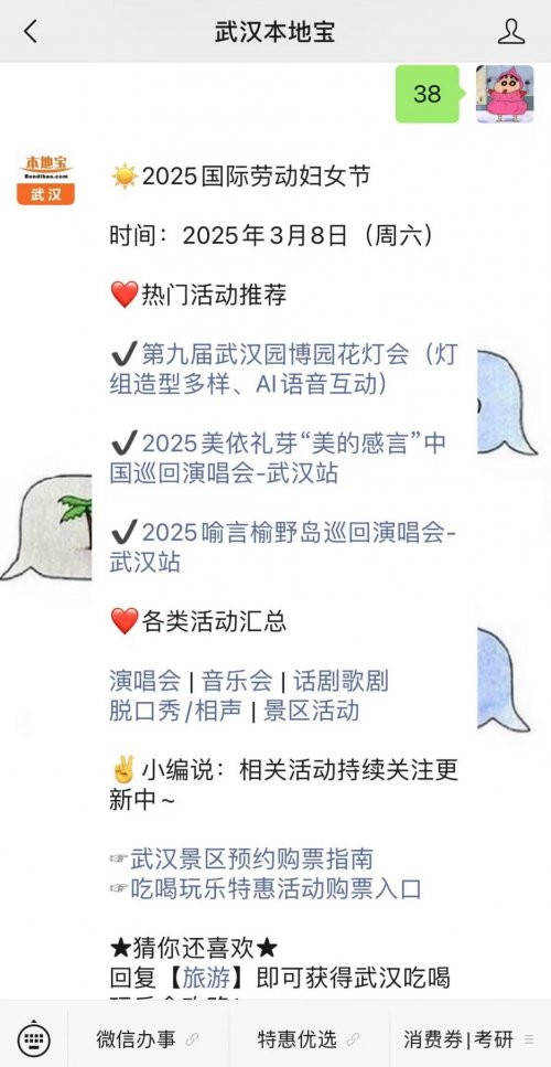温馨提示:微信搜索公众号【武汉本地宝】,关注后在对话框回复【38】可获2025武汉三八妇女节演唱会/音乐会/话剧歌剧演出/景区等活动汇总、吃喝玩乐特惠购票入口、景区预约购票指南及武汉赏樱花等赏花攻略等(更新中)。