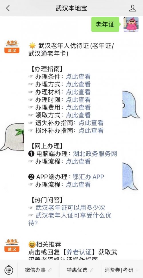 温馨提示:微信搜索公众号【武汉本地宝】,关注后在对话框回复【老年证】可获武汉老年证办理条件+材料+费用+办理方式、网上办理入口+流程、老年证使用次数及老年证优待福利政策等。