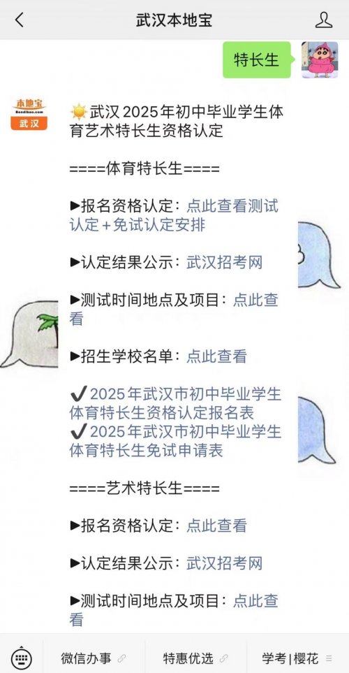 温馨提示:微信搜索公众号【武汉本地宝】,关注后在对话框回复【特长生】获取2025武汉中考体育及艺术特长生资格认定安排、认定结果公示信息查询入口、招生学校名单、相关报名申请表下载入口及更多武汉中考政策等最新消息。