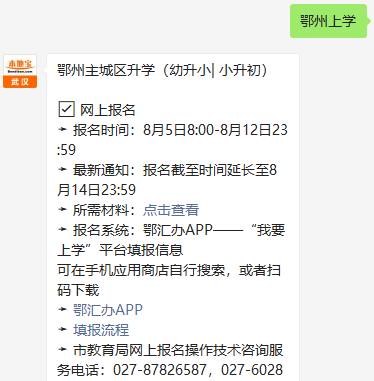 温馨提示:微信搜索公众号武汉本地宝,关注后在对话框回复【鄂州上学】可获鄂州中小学新生入学报名时间及入口、报名政策、入学流程、学区划片范围。