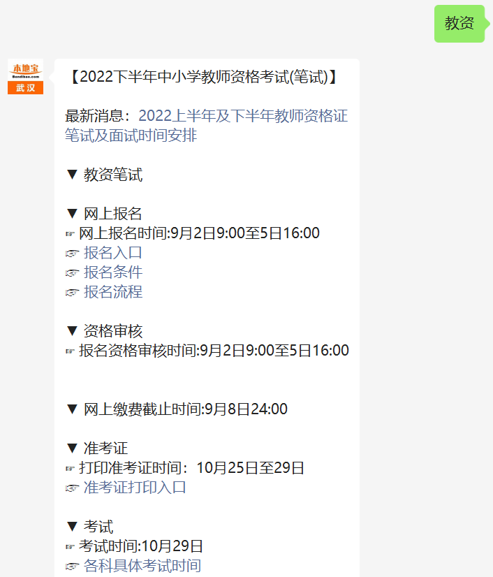 温馨提示:微信搜索公众号【武汉本地宝】,关注后在对话框回复【教资】即可获取2022湖北教资笔试报名时间+入口+条件+材料、资格审核时间及方法、考试时间、防疫要求
