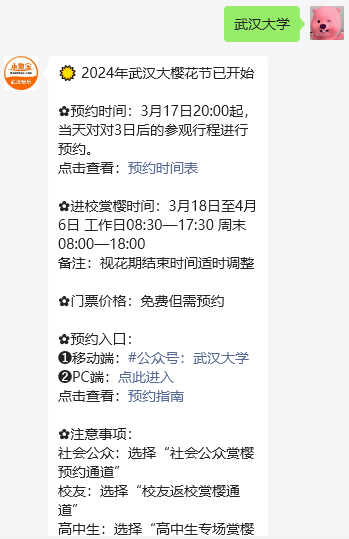 温馨提示:微信搜索公众号【本地宝武汉玩乐】,关注后在对话框回复【武汉大学】即可获得2024武汉大学社会公众进校预约时间及入口、可游览区域、进校入口、进校时间等,还有校友认证入口及流程!
