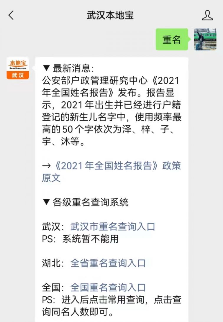 温馨提示:微信搜索公众号武汉本地宝,关注后在对话框回复【重名】可获武汉/湖北/全国重名查询系统入口,查看全国姓名报告及姓名用字规范。