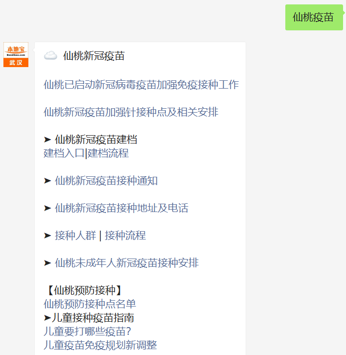 温馨提示:微信搜索公众号武汉本地宝,关注后在对话框回复【仙桃疫苗】可获仙桃新冠疫苗接种门诊地址电话、建档入口流程、最新消息。