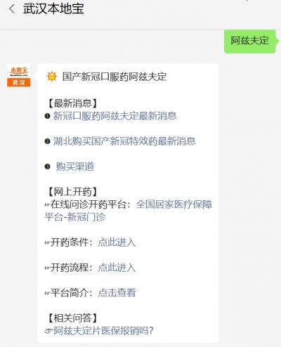 温馨提示:微信搜索关注【武汉本地宝】,对话框回复【阿兹夫定】可获新冠口服药阿兹夫定网上问诊开药入口+网购条件及流程、购买渠道、服用此药症状情况、用药方法+禁忌、购药服药最新消息等。