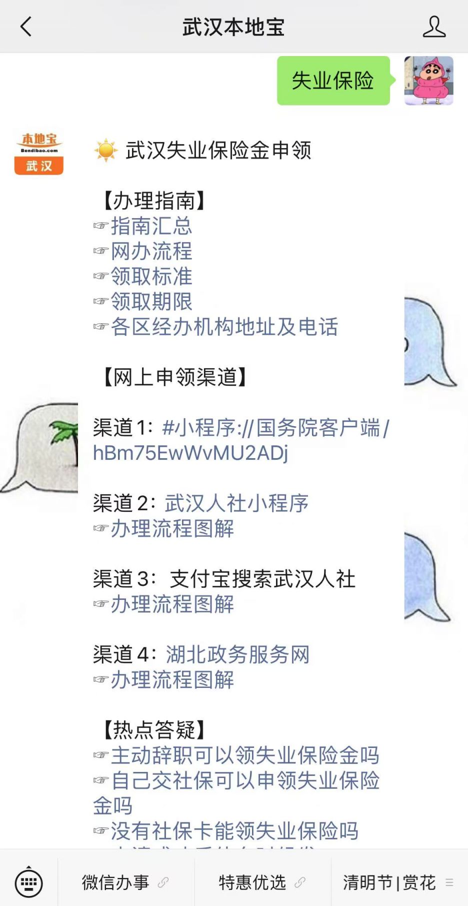 温馨提示:微信搜索公众号【武汉本地宝】,关注后在对话框回复【失业保险】即可获取武汉失业保险金申领条件/方式/标准/领取期限、失业保险参保缴费比例/方式/咨询电话、相关业务网办入口及更多武汉社保办事指引等。
