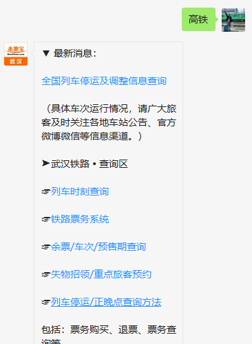 温馨提示:微信搜索公众号武汉本地宝,关注后在对话框回复【火车停运】即可查询途径武汉高铁/火车停运最新消息,查询列车时刻表、进入铁路票务系统。