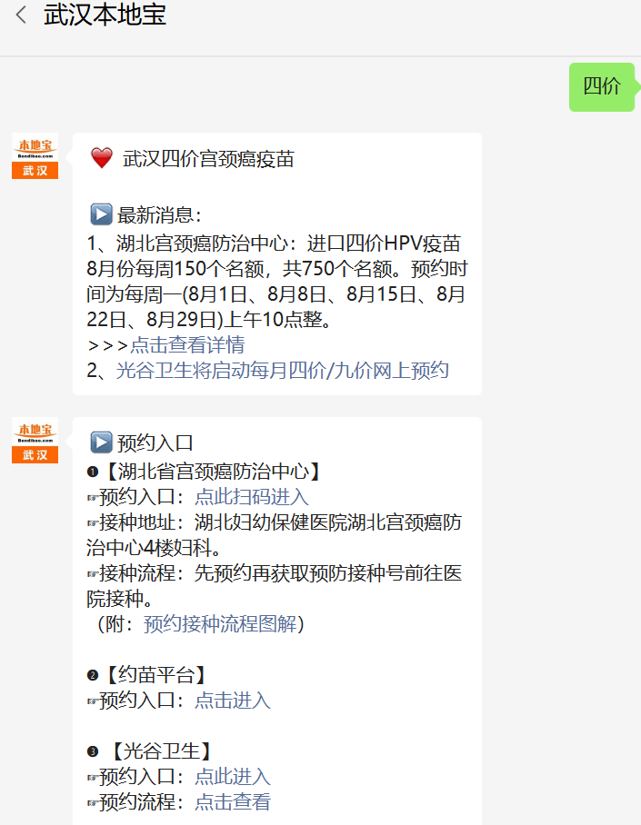 温馨提示:微信关注【武汉本地宝】公众号,在聊天框发送【四价】可获武汉四价预约入口、最新消息、接种地址、预约指南,还可加群及时了解最新预约消息!