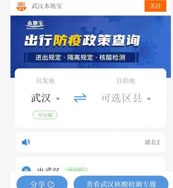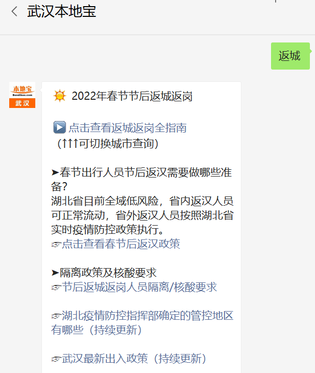 温馨提示:微信搜索公众号武汉本地宝,关注后在对话框回复【返城】可获2022武汉节后返城返岗政策、进出隔离/核酸要求、全国各地返岗防疫措施汇总。