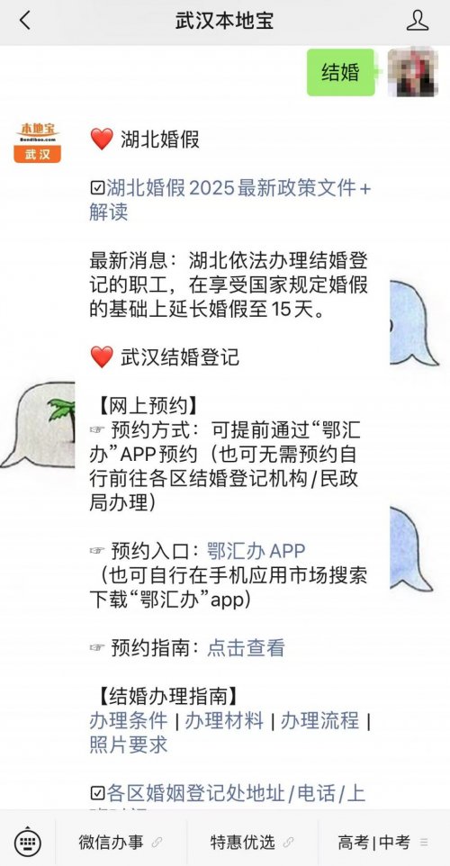 温馨提示:微信搜索公众号【武汉本地宝】,关注后在对话框回复【结婚】可获武汉结婚登记网上预约入口+流程、结婚登记办理条件/材料/流程/照片要求、各区婚姻登记处地址+电话、湖北婚假天数及武汉免费婚检地点等。