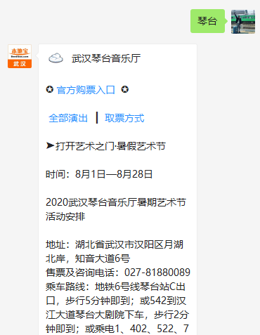 温馨提示:微信搜索公众号武汉本地宝,关注后在对话框回复【琴台】即可获得武汉琴台官方演出门票购票入口,活动安排、表演时间、各节目购票入口。