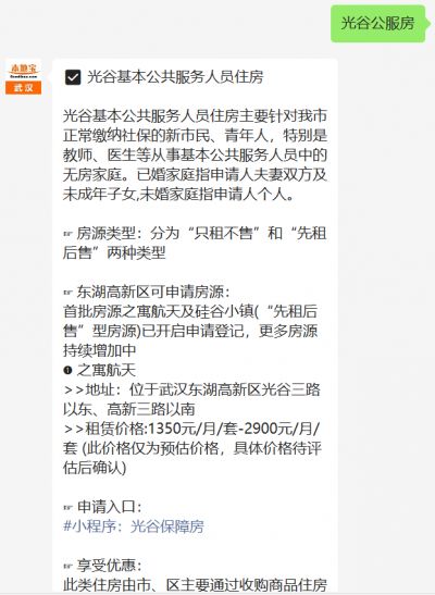 温馨提示:微信搜索公众号【武汉本地宝】,关注后在对话框回复【光谷公服房】直达光谷基本公共服务人员住房申请登记及资格审核入口、查询最新房源信息/物业费/户型/价格优惠/咨询电话!