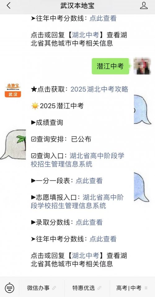 温馨提示:微信搜索公众号【武汉本地宝】,关注后在对话框回复【潜江中考】可获2025潜江中考录取分数线、一分一段表、志愿填报官网入口及录取安排等(更新中)。