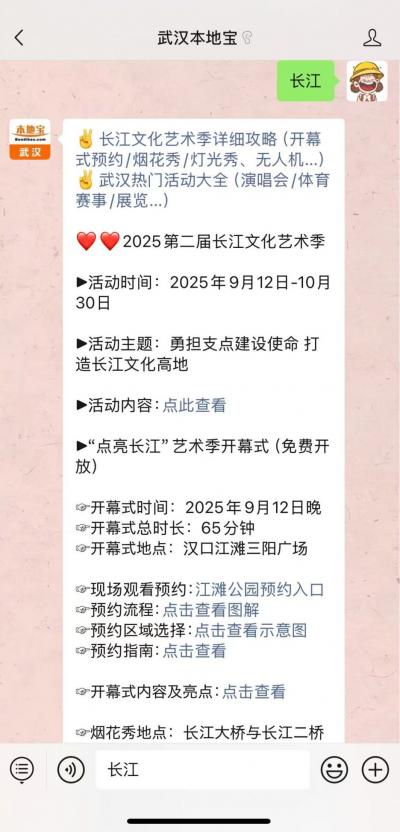 温馨提示:微信搜索并关注【武汉本地宝】,对话框发送【长江】可获2025年长江文化艺术季活动时间/地点、开幕式烟火秀/光影秀等现场观演预约入口、预约流程、表演时间地点、开幕式时长、开幕式内容、预约区域选择、预约记录查询入口、交通出行指引+管制路段、节目单及直播/回放入口等(更新中)。