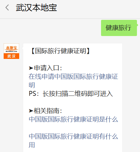 温馨提示:微信搜索公众号武汉本地宝,关注后在对话框回复【健康旅行】可获中国版国际旅行健康证明申请入口、用处、申请方式及相关问答。