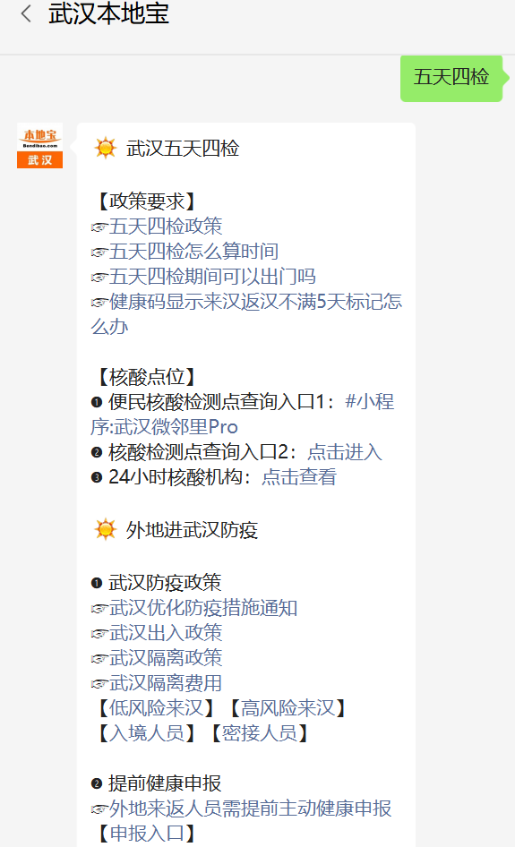 温馨提示:微信搜索关注【武汉本地宝】,对话框回复【五天四检】可查武汉五天四检要求政策+结束时间+能否出门+做核酸地点、最新隔离核酸要求、来汉报备入口。