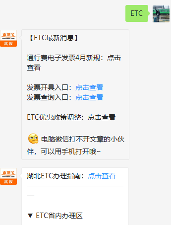 温馨提示:微信搜索公众号武汉本地宝,关注后在对话框回复【ETC】获取通行ETC办理指南、发票查询入口、办理银行入口等。