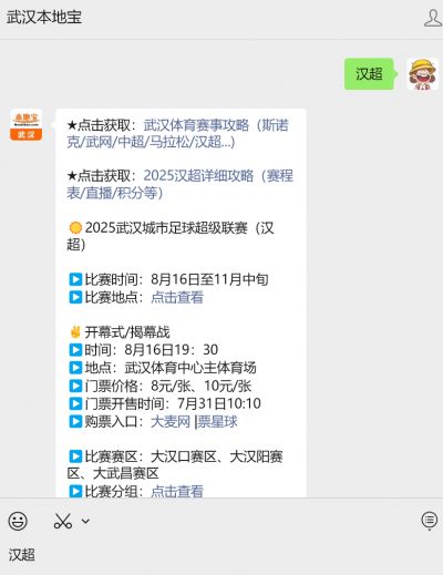 温馨提示:扫描上方二维码关注【武汉本地宝】公众号,关注后在对话框回复【汉超】可获2025武汉城市足球超级联赛(汉超)比赛赛程时间表/比赛地点、门票价格+购票入口、比赛规则/队伍名单、直播回放入口、球衣样式、最新比赛结果/积分榜及奖励奖金等(更新中)。