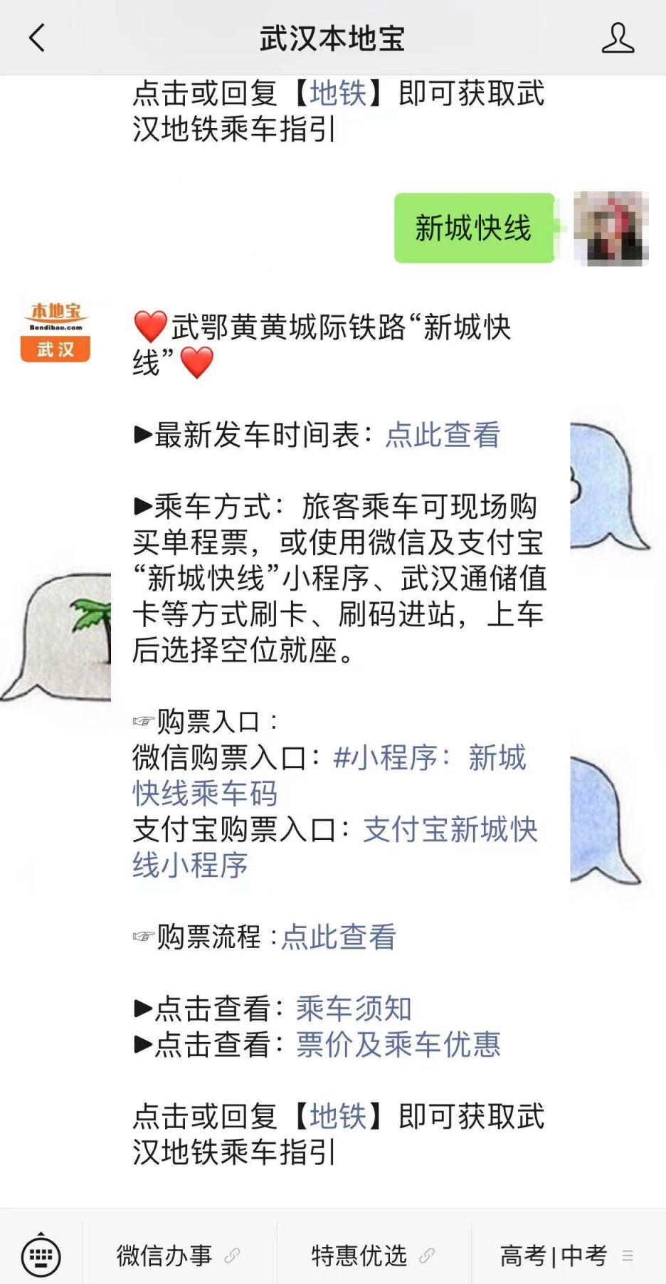 温馨提示:扫描上方二维码关注【武汉本地宝】公众号,关注后在对话框回复【新城快线】获取武汉新城快线最新消息,最新运营时间表、票价+优惠政策、购票入口/购票流程及乘车须知等。